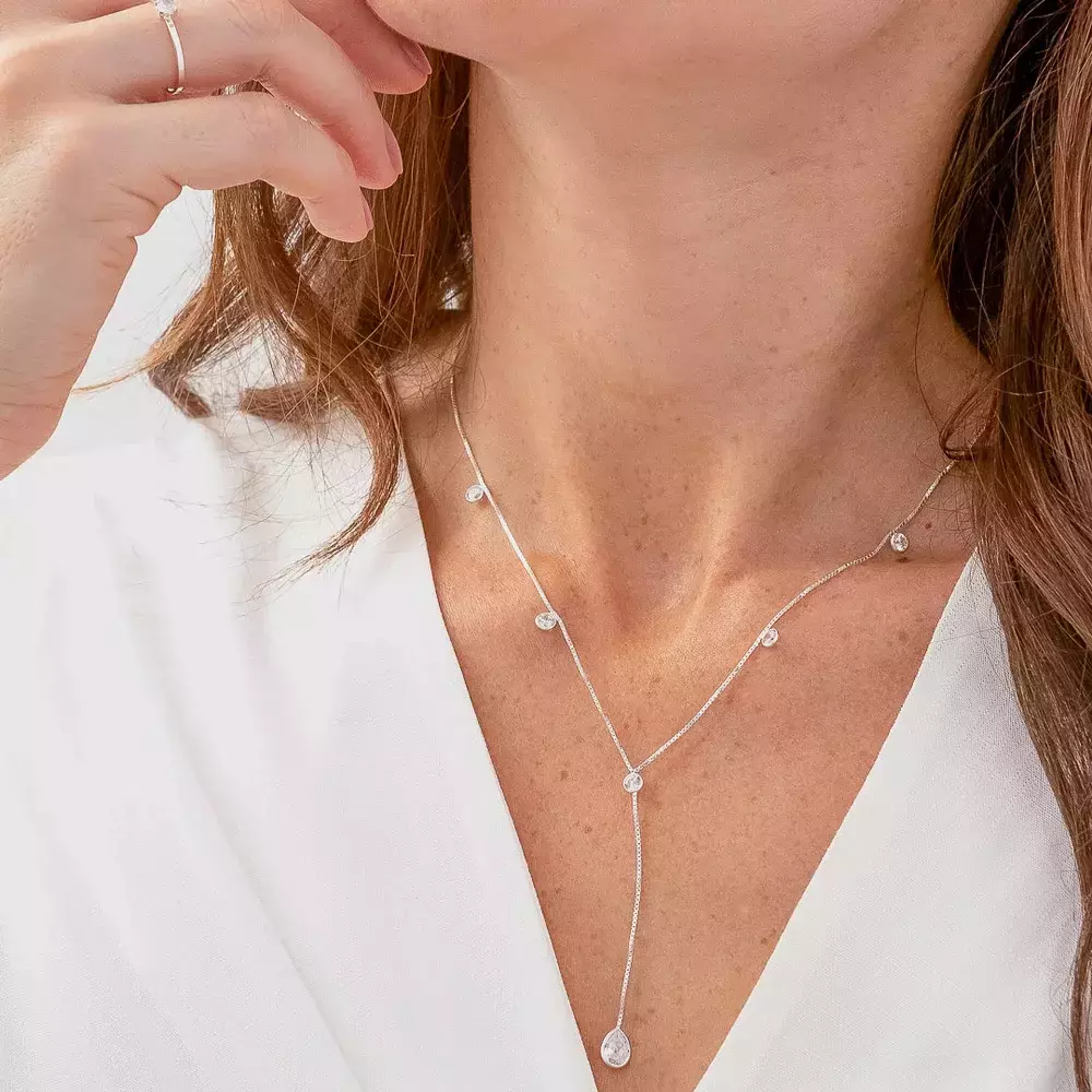 Gargantilha Estilo Gravatinha com Gota e Pontos de Luz em Prata 925: Elegância que se Adapta a Você